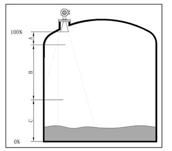 - 若介質(zhì)為低介電常數(shù)當(dāng)其處于低液位時(shí),罐低可見,此時(shí)為保證測(cè)量精度,建議將零點(diǎn)定在低高度為C 的位置。