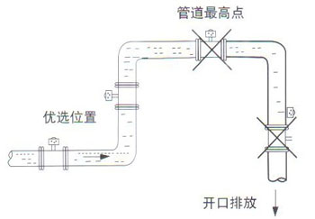 4. 電磁流量計安裝位置介質不滿管時,可采取抬高流量管后端管路的方法,使其滿管,嚴禁在管道最高點和出水口安裝流量計。(見圖)