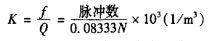 實驗采用稱量法,記錄電子稱上的質量脈沖數N,N乘以質量脈沖常數(0.08333),即得到質量值(kg),同時記錄時間和渦輪變送器的脈沖數,在每個流量點重復做三次,記錄三組數據,共選擇5個流量點來覆蓋渦輪流量計的測量量程。流量Q=0.08333N/t,儀表系數為: