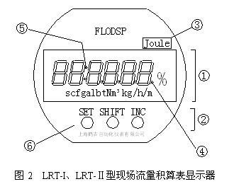 LRT-I、LRT-Ⅱ型氣體渦輪流量計現場流量積算表顯示器各部分說明見圖2和表1。