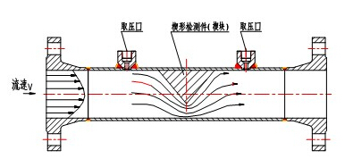 一體化智能型楔形流量計流量傳感器的檢測件是楔形孔板,它是一塊V形節(jié)流件,它的圓形頂角朝下,這樣有利于含懸浮顆粒(粉塵、泥沙及其它固體顆粒)流體和高粘度液體流過時在節(jié)流件上游側(cè)不會產(chǎn)生滯流,也不會在節(jié)流體上、下游側(cè)發(fā)生固體顆粒或粘稠物的積存,從而確保楔形流量傳感器長期運行穩(wěn)定性:±0.1FS%Y,這樣高的長期運行精度在流量測量領(lǐng)域是迄今少見的。楔形流量傳感器的結(jié)構(gòu)如圖1所示。