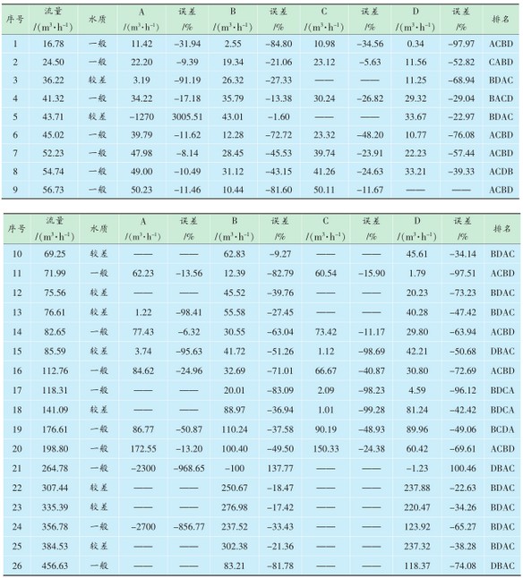 表3 較差水質時流量計誤差統計