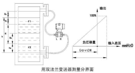 c、雙插入筒型法蘭液位變送器測(cè)量如圖: