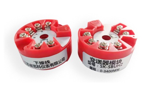 SK-SBUHZ型液位變送器模塊是將輸入的電阻信號轉換成線性輸出的4~20mA電流信號,從而達到與磁翻板液位計配套使用,通過磁翻板液位計內部浮子的位置的變化而將磁翻板液位計內部對應的液位變化線性地對應輸出液位高度。