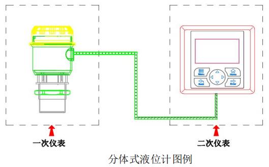 分體式由顯示儀表(二次儀表)和超聲波傳感器(一次表)兩部分組成,結構如下(外觀尺寸見6.1.1):
