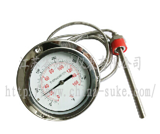 利用感溫包中液體受熱膨脹而使彈性元件產(chǎn)生偏轉(zhuǎn)來帶動度盤轉(zhuǎn)動指示出被測介質(zhì)的溫度。