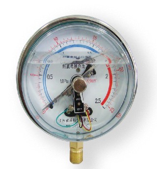在電接點(diǎn)壓力表裝置的電接觸信號針上,裝有可調(diào)節(jié)的永久磁鋼,可以增加接點(diǎn)吸力,加快接觸動(dòng)作,從而使觸點(diǎn)接觸可靠,消除電弧,能有效的避免儀表由于工作環(huán)境振動(dòng)或介質(zhì)壓力脈動(dòng)造成觸點(diǎn)的頻繁關(guān)斷。所以電接點(diǎn)壓力表具有動(dòng)作可靠、使用壽命長、觸點(diǎn)開關(guān)功率較大等優(yōu)點(diǎn)。